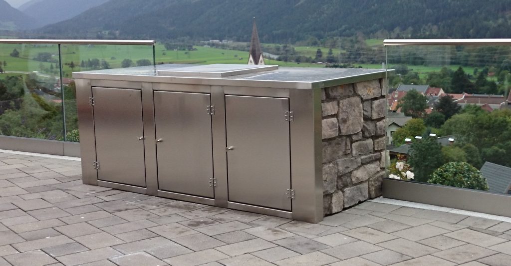 Hier wurde für einen Kunden ein Traum vom Selbstbau-Grill aus Edelstahl erfüllt. Dabei wurde die Unterkonstruktion von einem Maurer vorgefertigt. Wir konstruierten einen Grilleinsatz, der in das Mauerwerk versenkt wurde. Zudem wurde die Edelstahl-Front und die Tischauflage gefertigt.